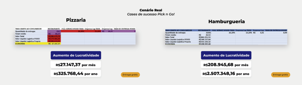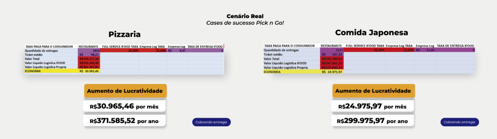 Reunimos alguns casos reais de estabelecimentos que adotam um sistema de entregas próprias e conseguiram reduzir seus custos operacionais. Essa redução de custos se expressa significativamente na maior lucratividade para o restaurante através de uma grande economia. Os dados apresentados nas planilhas abaixo são de clientes da Pick n Go que decidiram otimizar sua logística, controlando melhor suas margens e aumentando seus lucros.