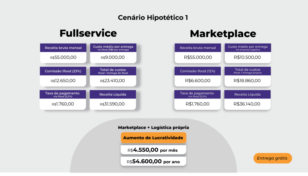 A estratégia de Marketplace + Logistica Própria, que oferece taxa grátis de entrega ao cliente, permite que o restaurante deste caso hipotético lucre R$4.550,00 a mais por mês, chegando a R$54.600,00 ao ano.