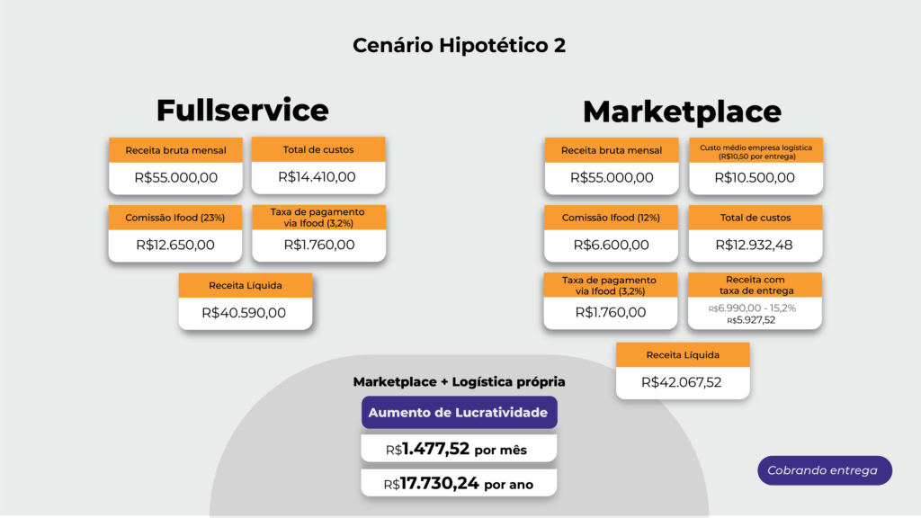 Da mesma forma que no cenário anterior, ainda que o custo por entrega de uma empresa logística seja maior do que o custo por entrega do iFood, a receita líquida dos contratos Marketplace superam a do contrato completo.